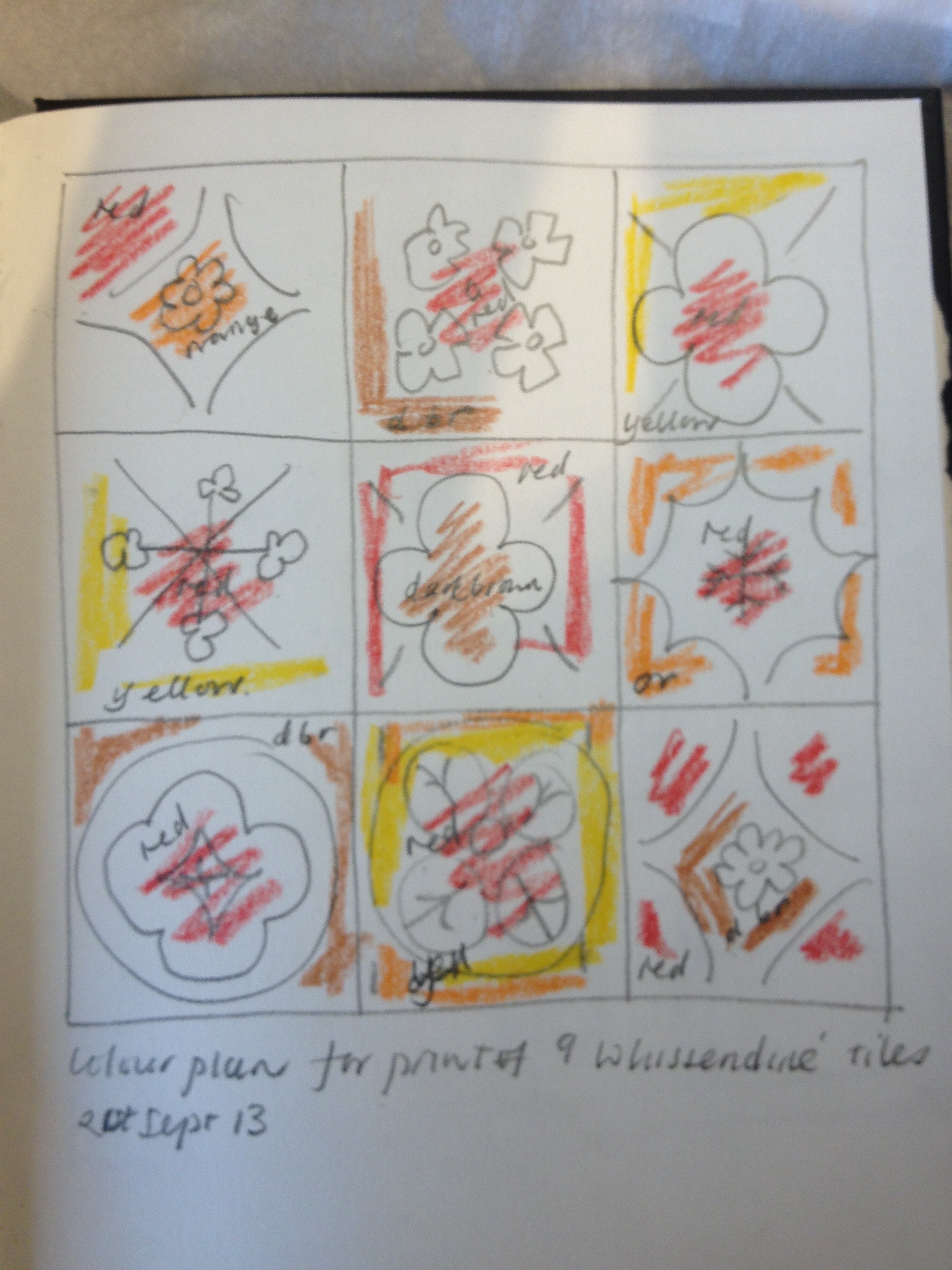 Colour plan for print of 9 Whissendine tiles (look in collagraphs later!)