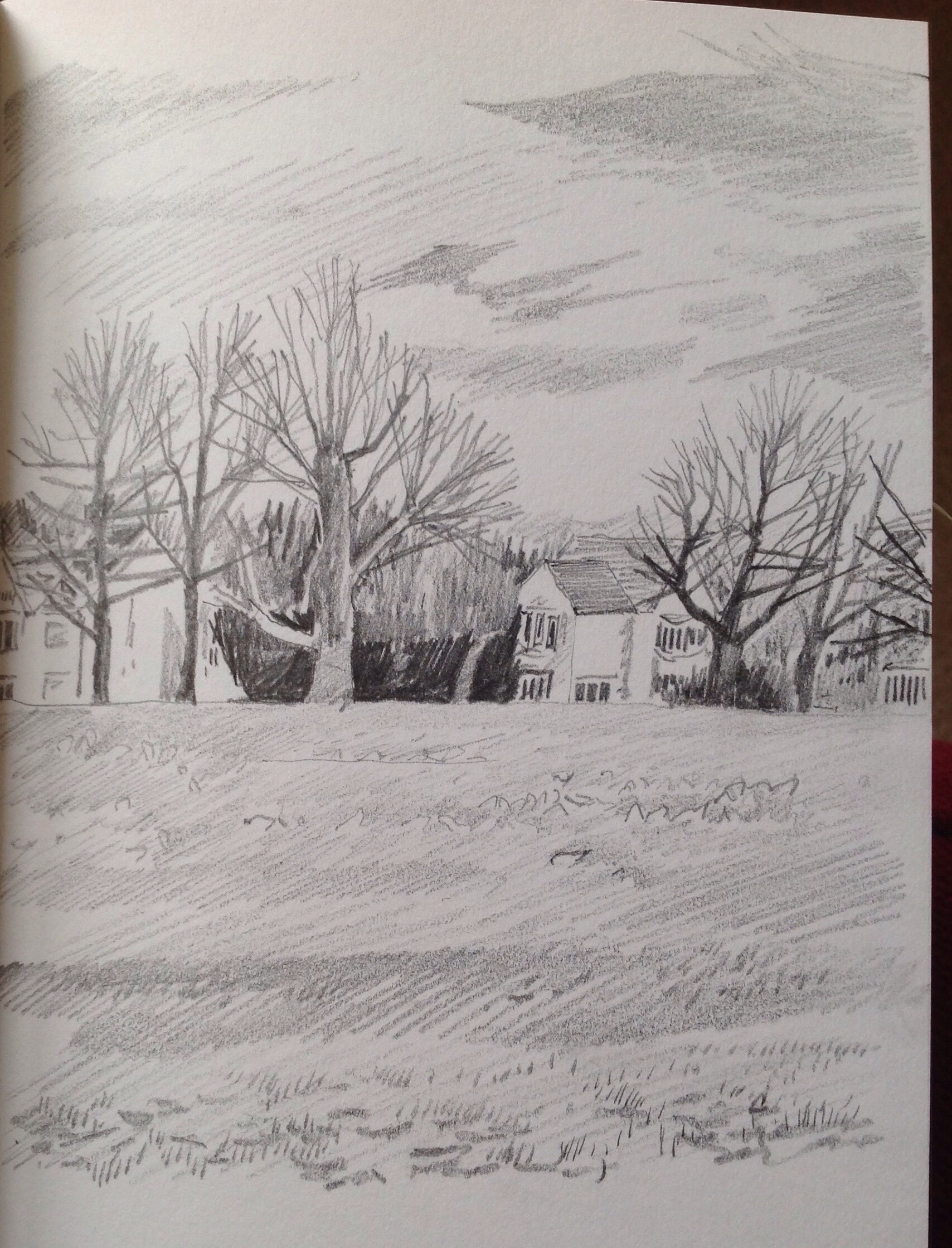 Abington Park ( I was drawn to this view by the mass of white birds on the grass in the distance but they haven’t come out right in the drawing!)