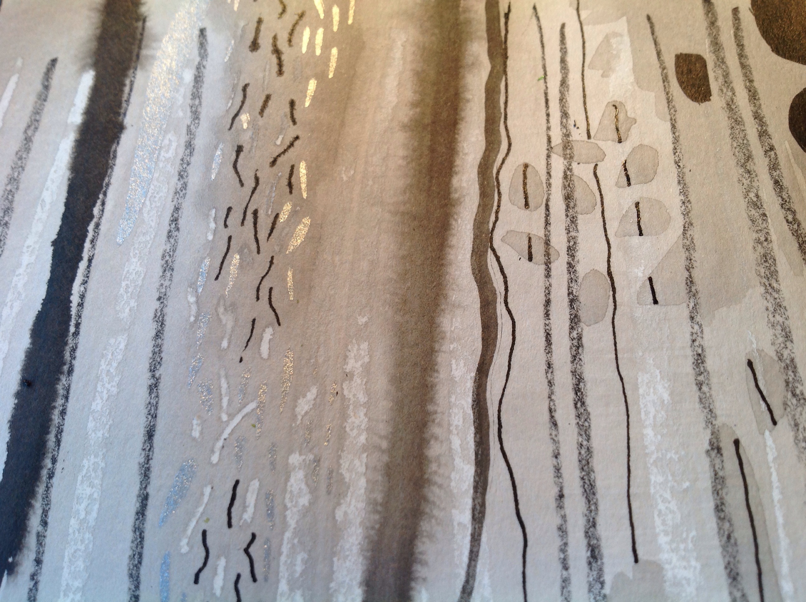 Wax crayon, brush, dip pen, on wash, wet, damp and dry paper,