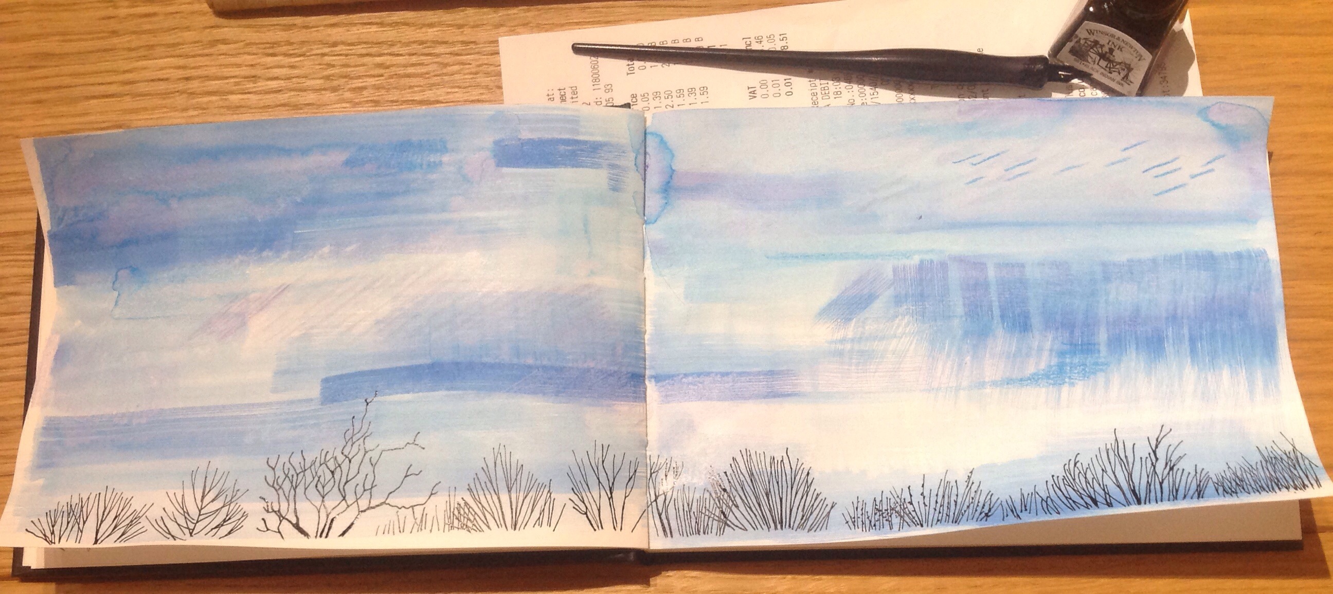 Wax resist, dip pen and ink