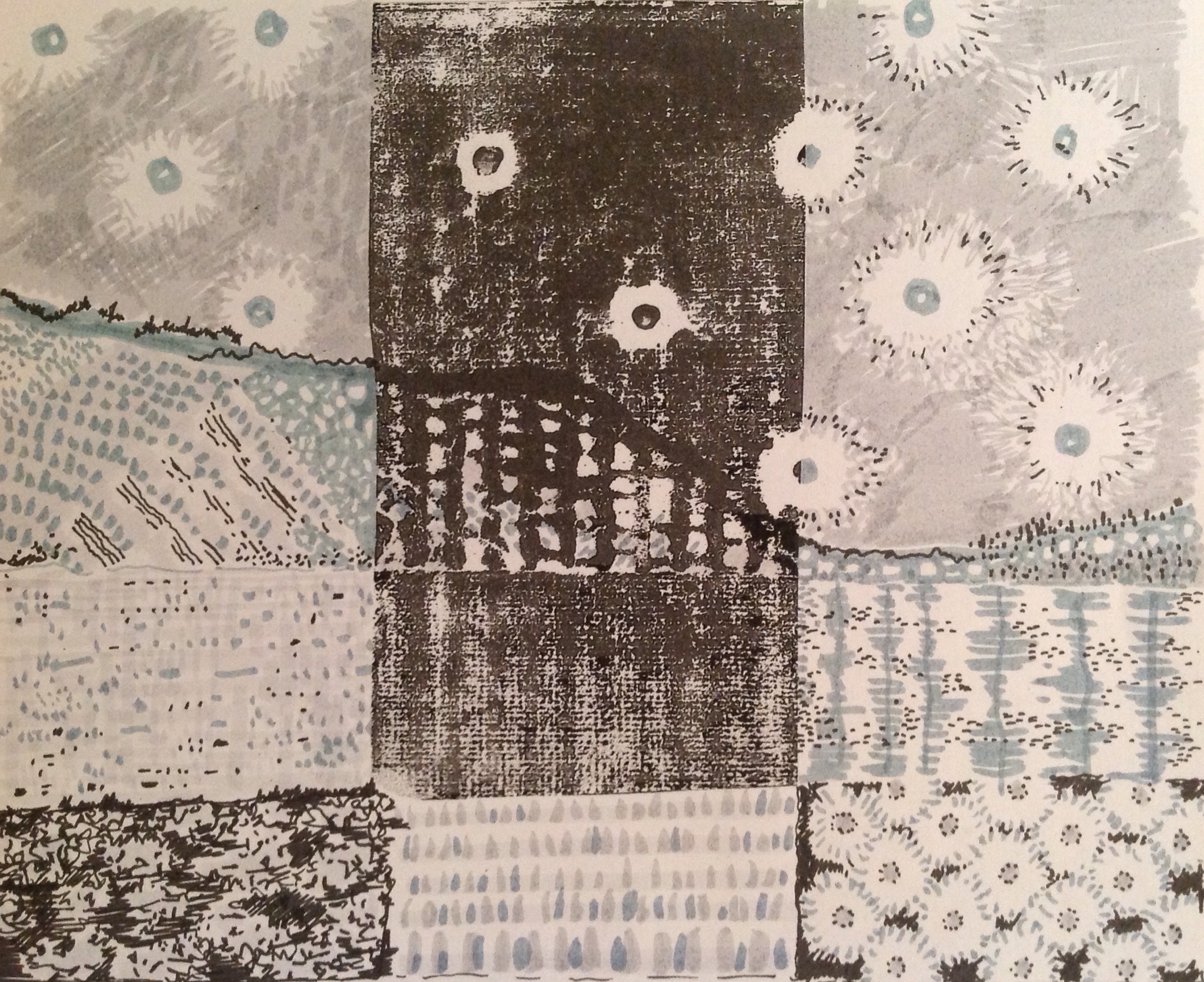 Collage relief print, pen drawing