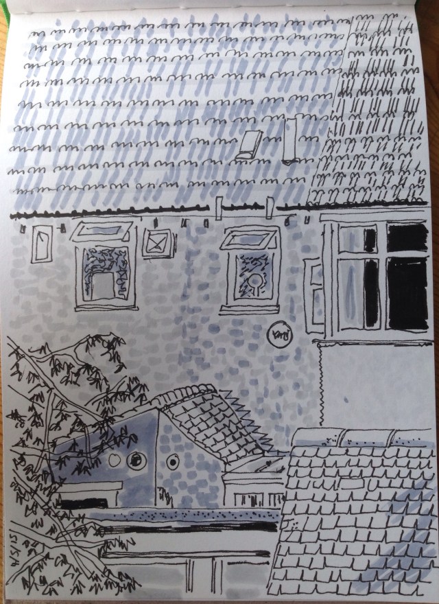View from upstairs (drawn using the shortsighted left eye and thenewly corrected right eye – I can see the view quite well, but I can only see the sketchbook page through blurred and double vision.