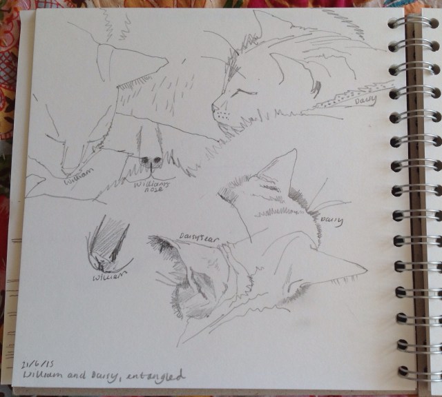 William and Daisy, entangled. William and Daisy are entangled on the bed, and since they kept moving the drawings are entangled on the page.