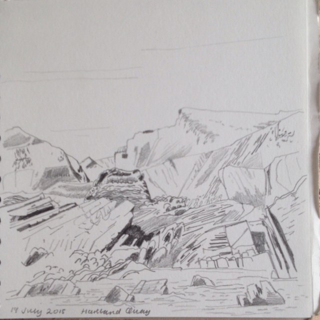 The geology of the land is so visible at Hartland Quay – it’s quite amazing! It’s quite hard to know where to start to draw as there is so much to see and the structures and patterns are so unfamiliar. The weather was perfect – despite a poor outlook in the morning by the afternoon it was bright blue and sunny and a very clear view.