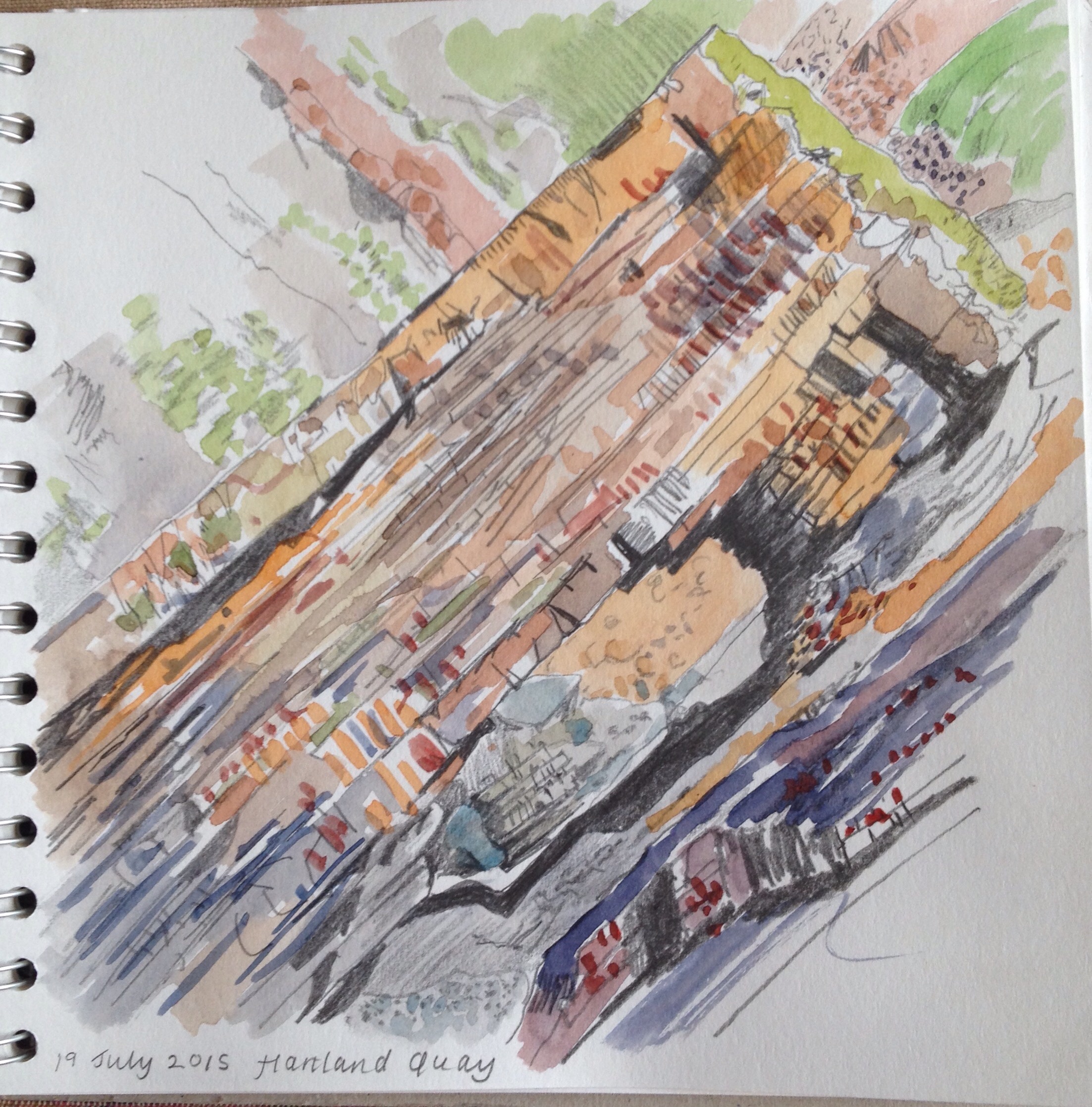 The geology of the land is so visible at Hartland Quay – it’s quite amazing! It’s quite hard to know where to start to draw as there is so much to see and the structures and patterns are so unfamiliar. The weather was perfect – despite a poor outlook in the morning by the afternoon it was bright blue and sunny and a very clear view.