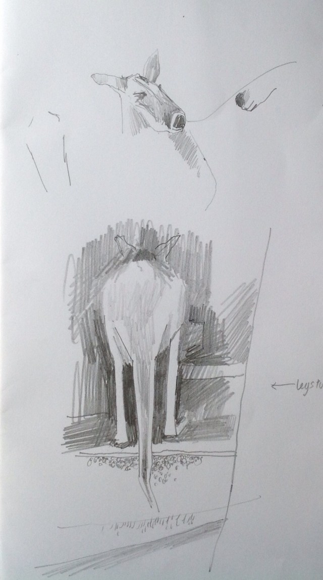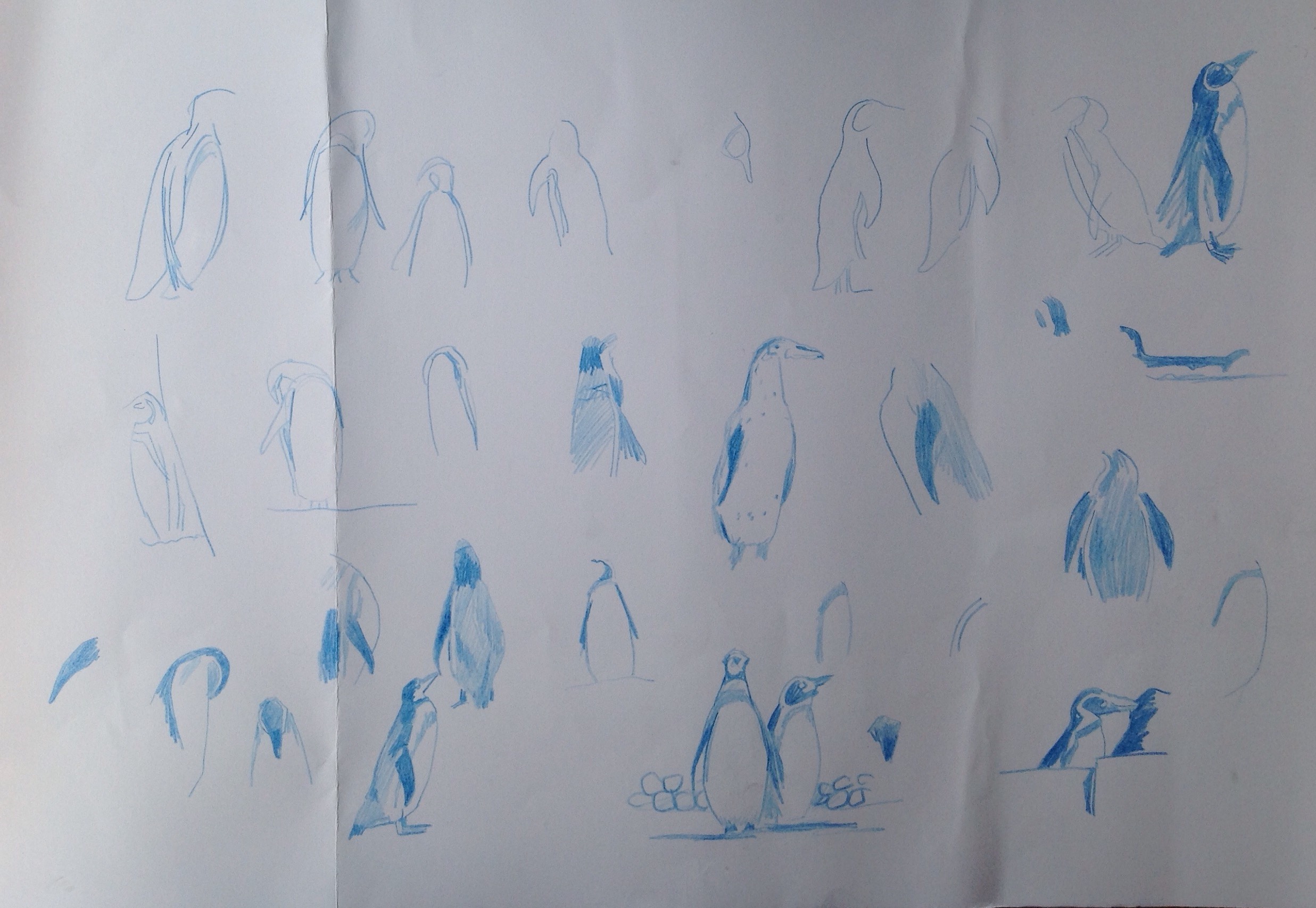 We began with the penguins and Tim, the artist leading the day, encouraged us to use blue pencils as early Disney animators would have done. This page show my journey from never having drawn a penguin to trying to represent some of the form – quite hard as they did tend to move a lot! Sitting for an extended period we could see that the Penguins would often return to similar poses so I think that staying there for a long time would be the best approach.