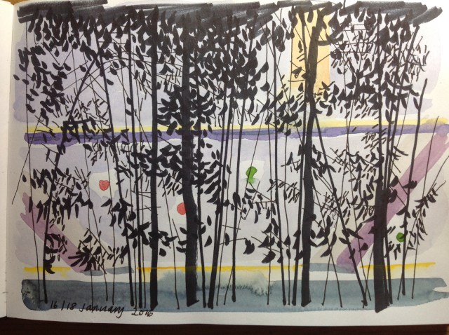 On Saturday in the Sky Garden my eye was caught by these dark leaved plants against the translucent sides, with some brought spots of colour showing mistily through the leaves – traffic lights and sun between buildings. I made a wash of the background from life on Saturday and then drew the levels on this evening.