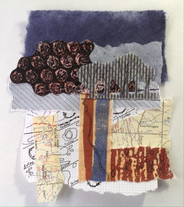 Collage from mixed media, found and made papers, drawn detail