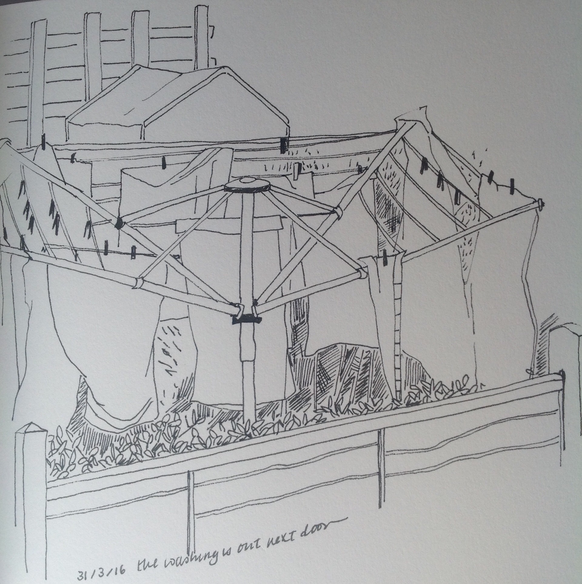 I was attracted to drawing this because the white washing looked so lovely against the garden, but the washing line contraption was terribly difficult to draw!