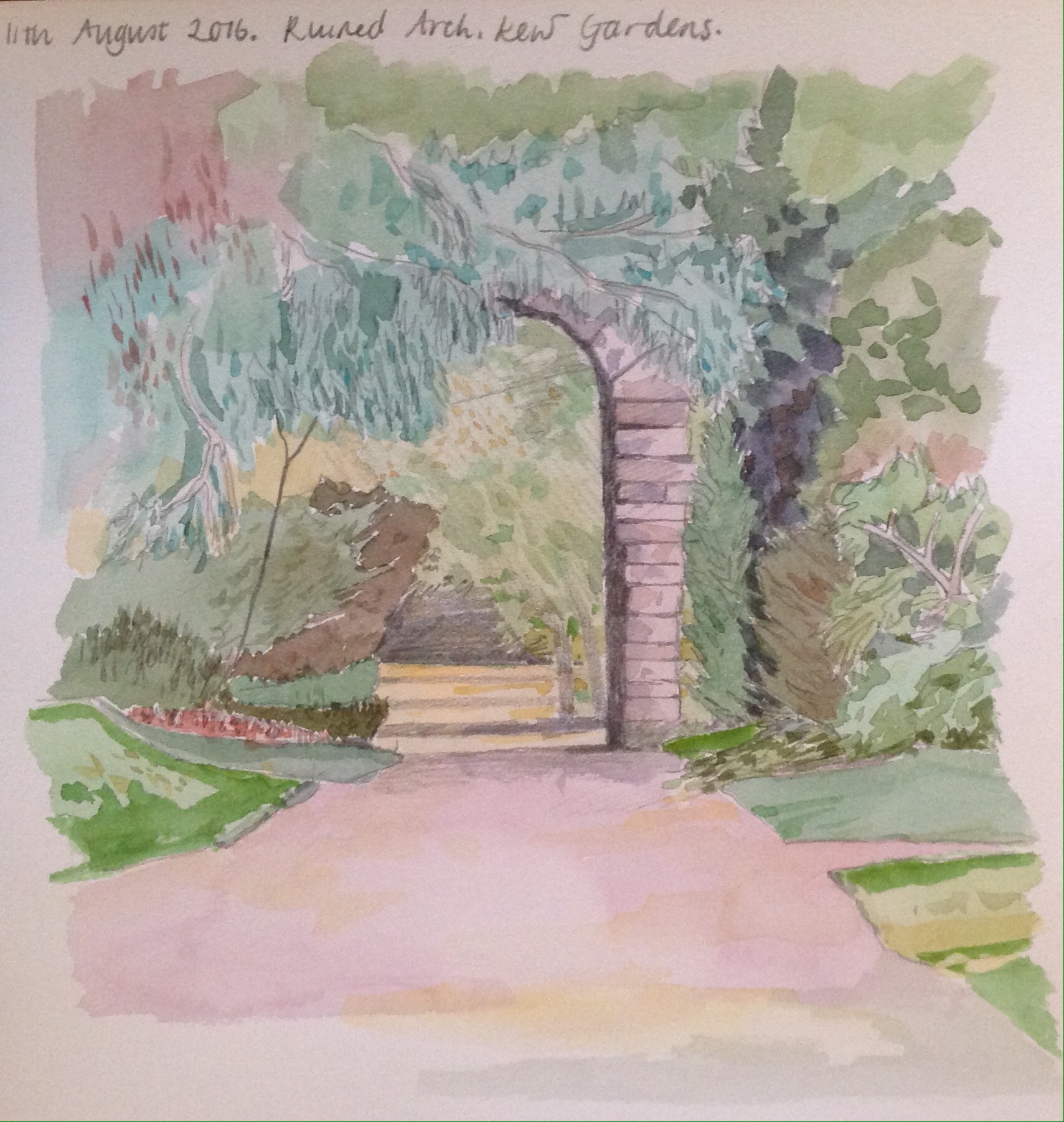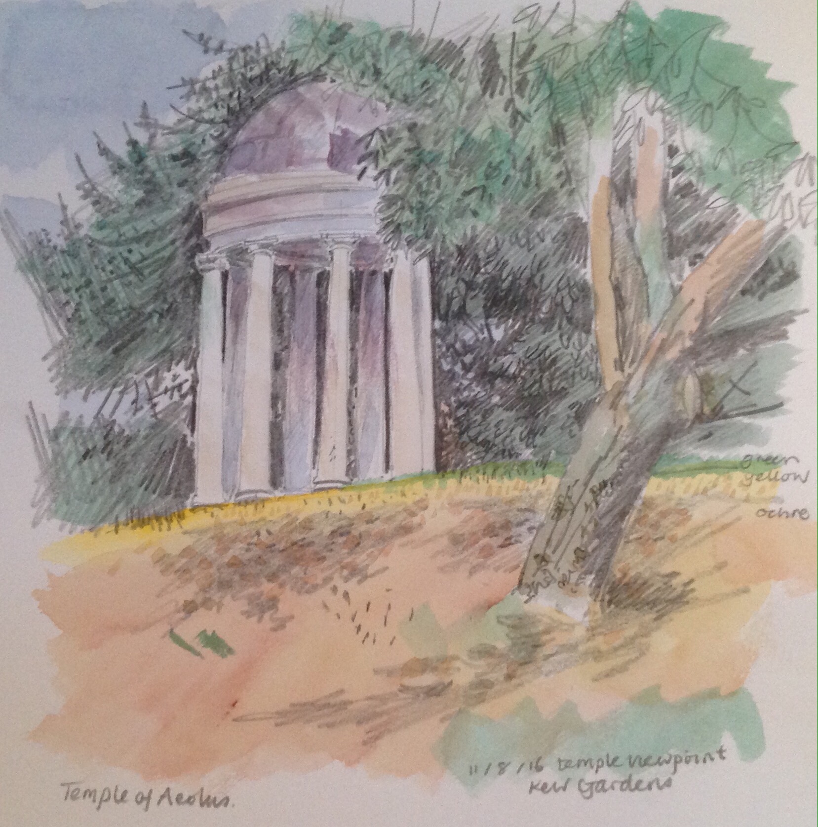 Temple of Aeolus, Kew Gardens (Towards the end of making this drawing I was joined by a grandma and her grand daughter from Brazil and some children from several families who all gathered round and talked about how they liked drawing and painting too! Their enthusiasm was great to hear, as well as the nice things they said about this drawing.)