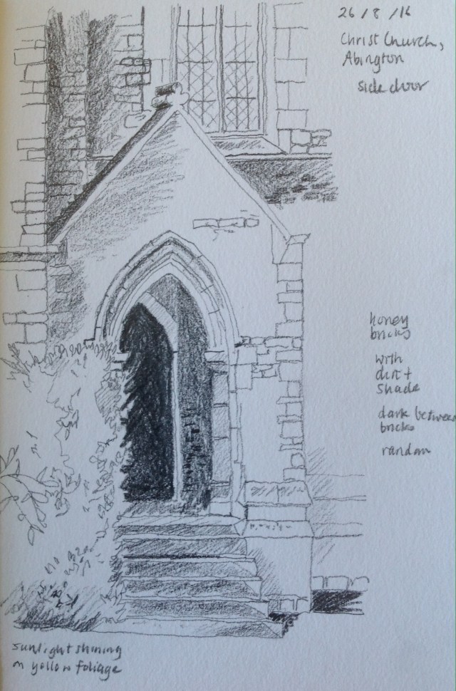 Christ Church, Abington (side door) I’ve been wanting to draw this side door with bright yellow hedge beside for a long time and finally at lunchtime I managed to do it. No time for colour this time, but I’ll go back again with watercolours.