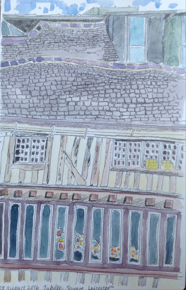 Today I joined Leciester Sketch Club for an urban sketching day around the city. We began in Jubilee Square along side lots of cyclists taking part in the Skyride. This building is Wygston House, with some modern buildings behind.