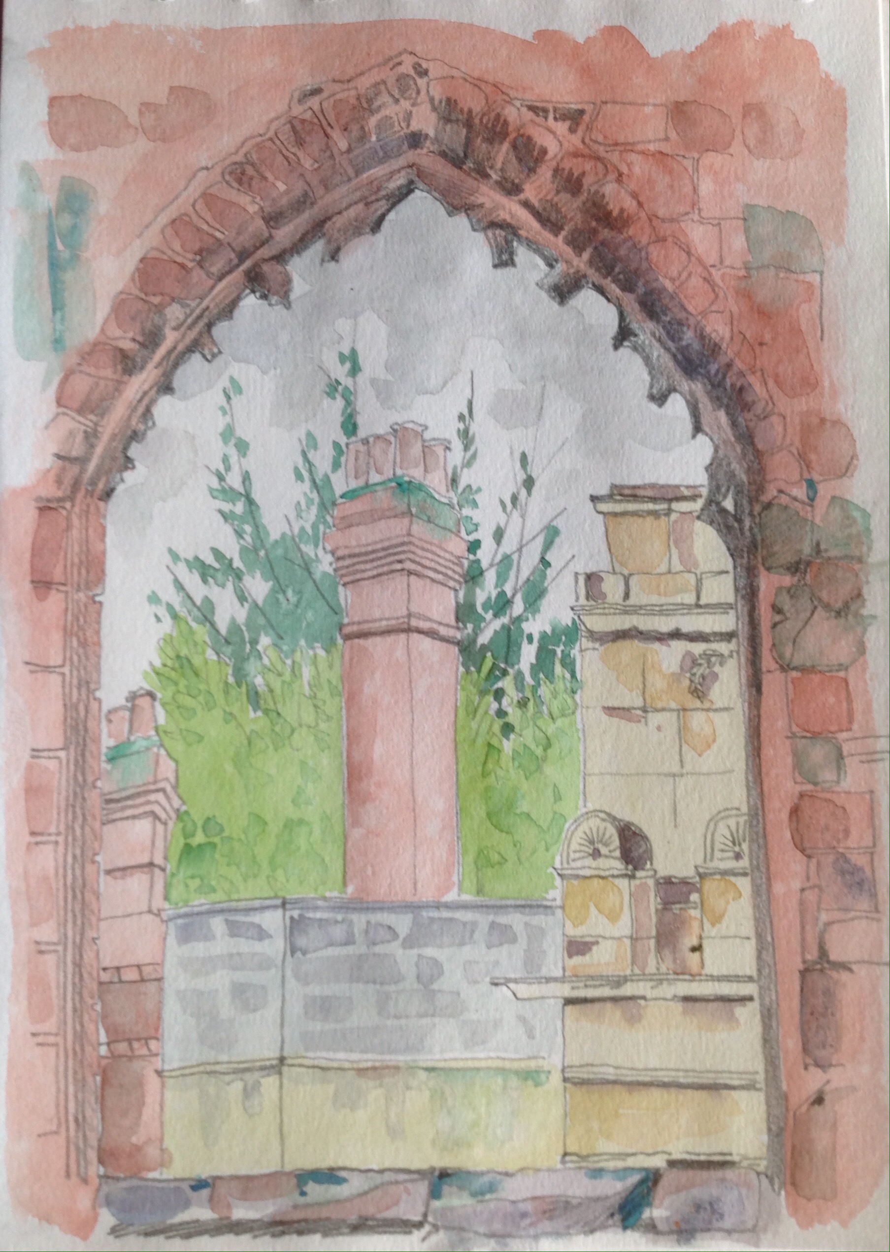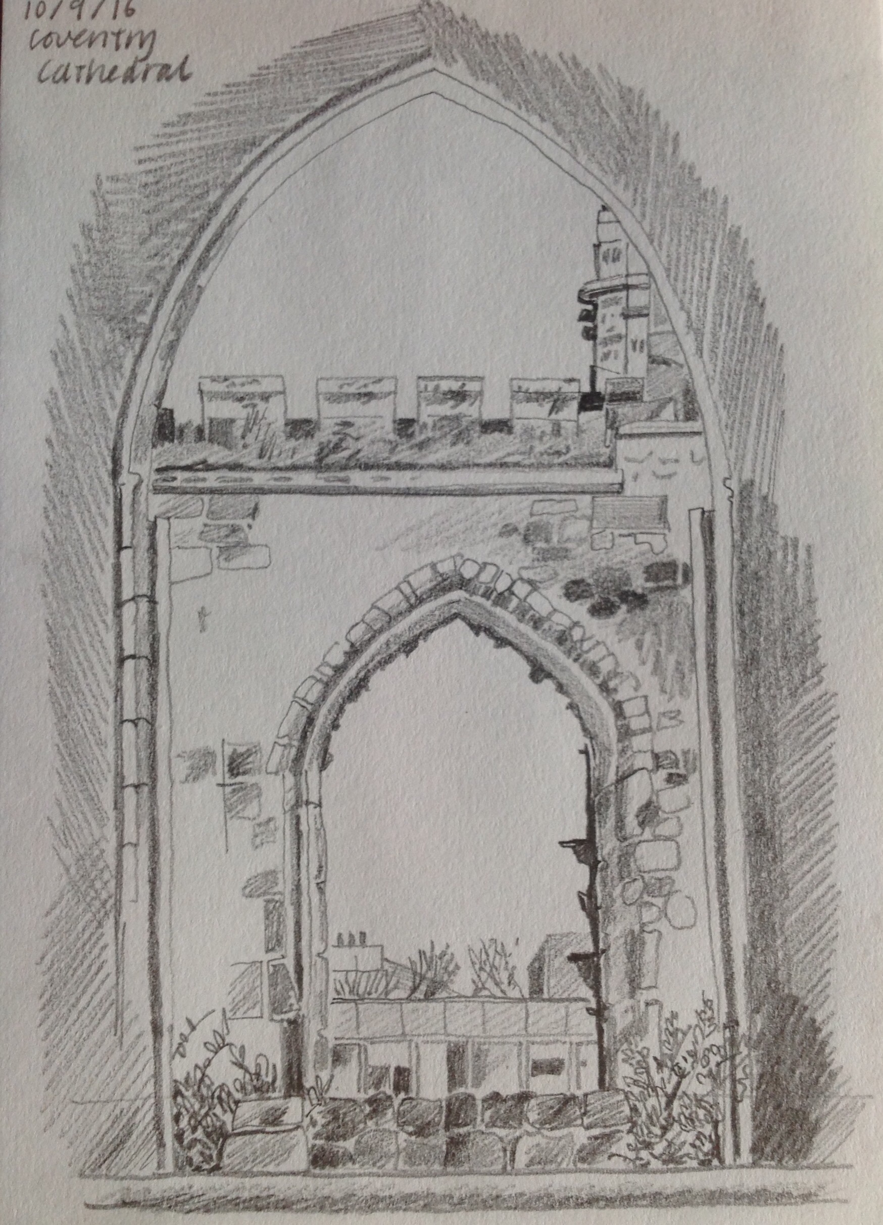 At Coventry Cathedral, with #SketchCoventry ( it was so rainy that the surface of the paper was wet throughout making the watercolour very watery!)