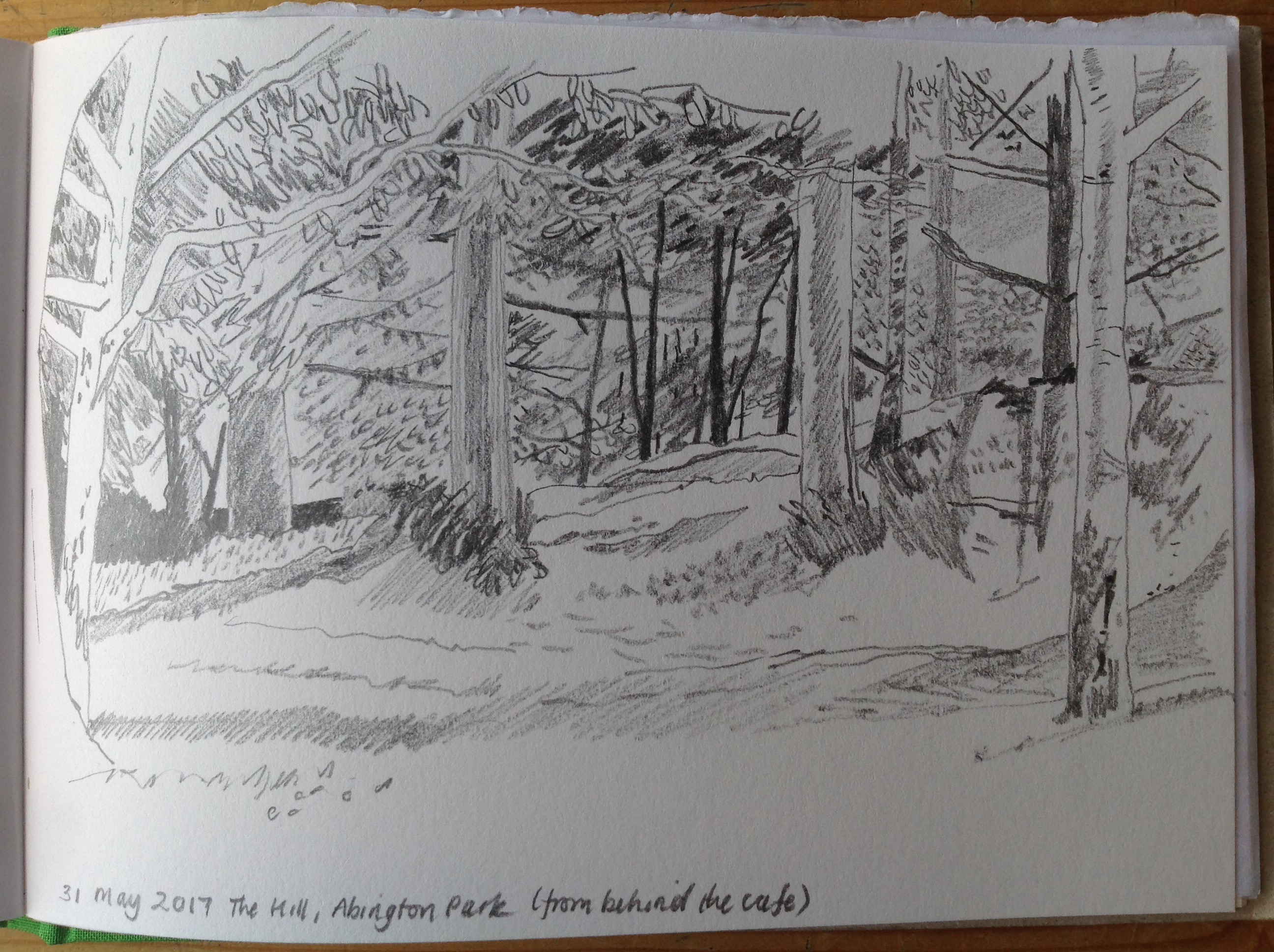 Now the trees have their foliage I am faced with the usual challenge of how to represent that on paper. Having just been to see the David Hockney exhibition I’ve been trying to learn from his set of twenty five drawings where he used tone and mark making together. I will keep trying!