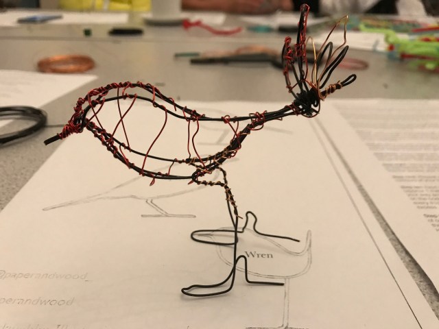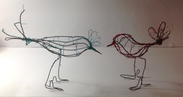 He demonstrated how to use two different thicknesses of wire to make the structure of a bird and decorate it. I had the opportunity to make one bird to learn how and another to experiment and refine the technique. The linear quality of the wire being manipulated in space was so like an extra challenging version of drawing with a pen on paper and this was further emphasised by photographing the shadows of the birds.