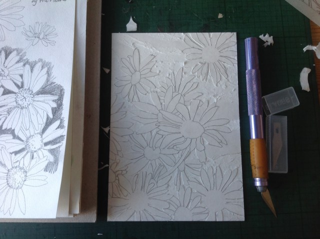 Pencil, craft knife on mountboard