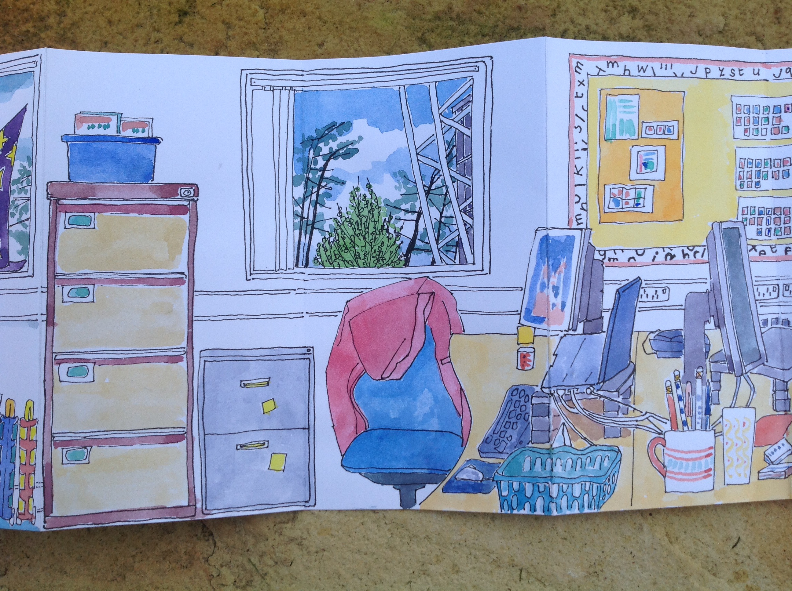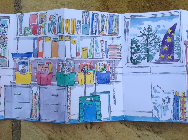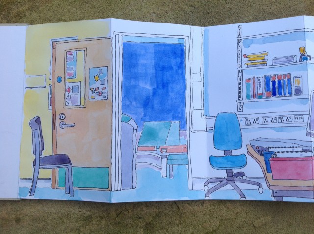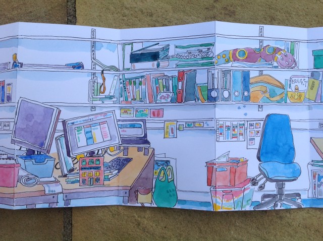 A concertina sketchbook that provides a panoramic view of the English team office just before it changed to prepare for moving to Waterside, the new university campus in Northampton. It records something of the way the people made space their own, reflecting their teaching approaches through the objects they surrounded themselves with.