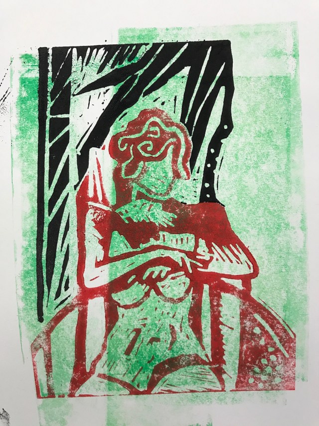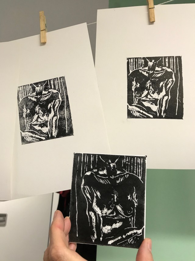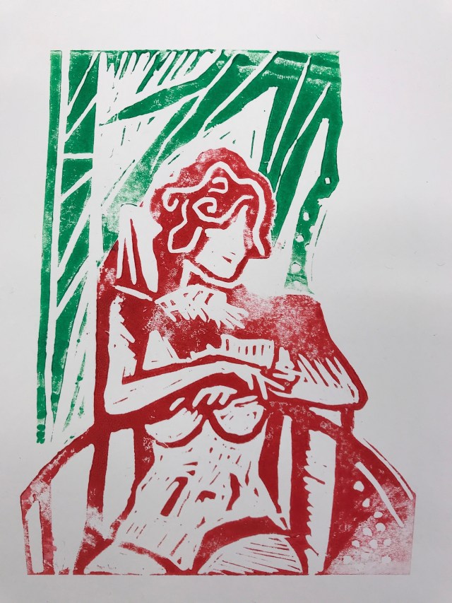 In the after noon we had a go at making a link blaock and printing from it, based on another pose from life. This was much harder in terms of time, physical wear and tear on my hands and challenge of how unforgiving of mistakes the lino surface is. The pose was hard in that both the model’s hands were prominent in the pose too! I liked how it’s easy to cut the Lino, getting away from straight edges and using different colours on different pieces.