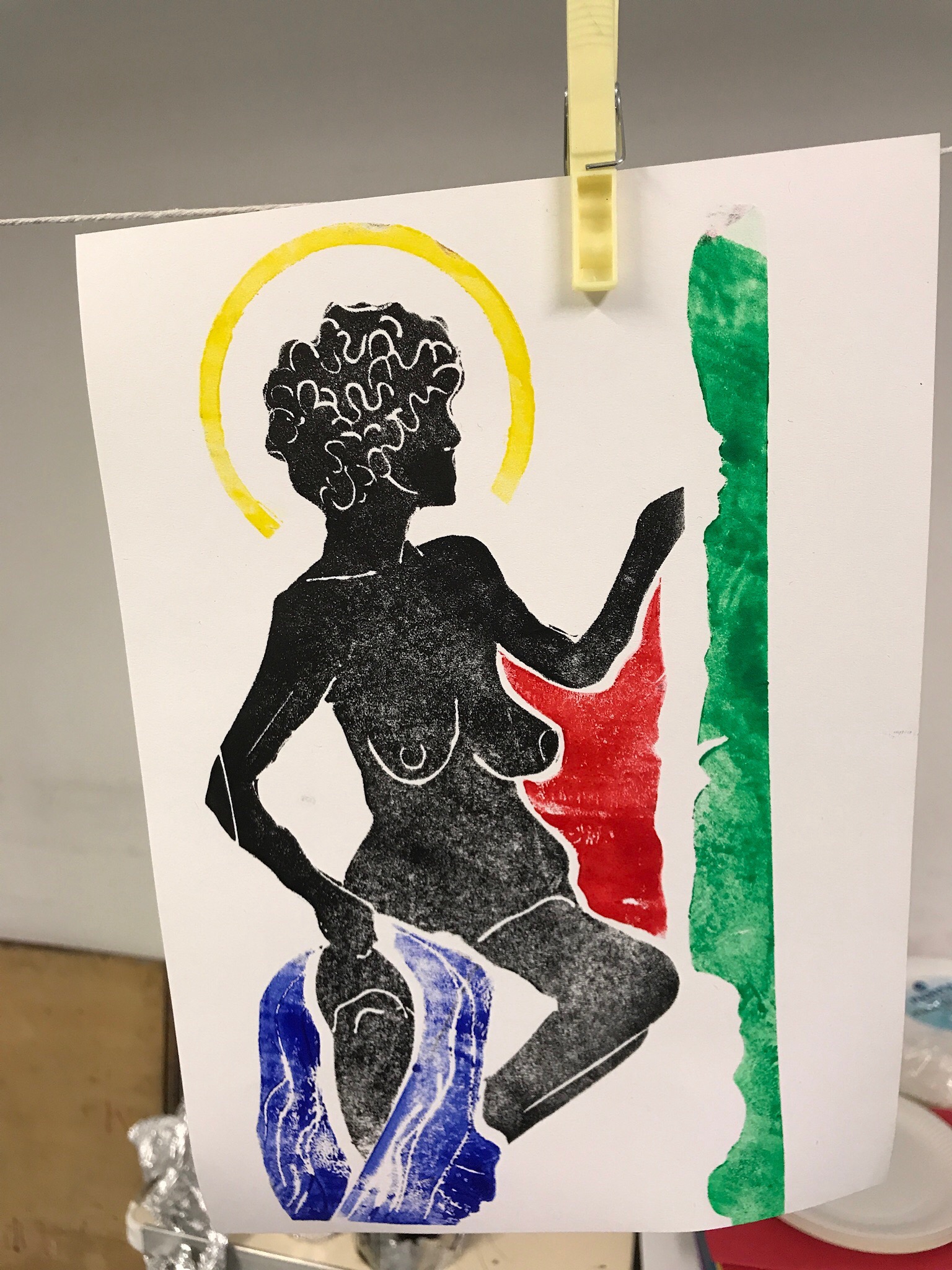 In the after noon we had a go at making a link blaock and printing from it, based on another pose from life. This was much harder in terms of time, physical wear and tear on my hands and challenge of how unforgiving of mistakes the lino surface is. The pose was hard in that both the model’s hands were prominent in the pose too! I liked how it’s easy to cut the Lino, getting away from straight edges and using different colours on different pieces.