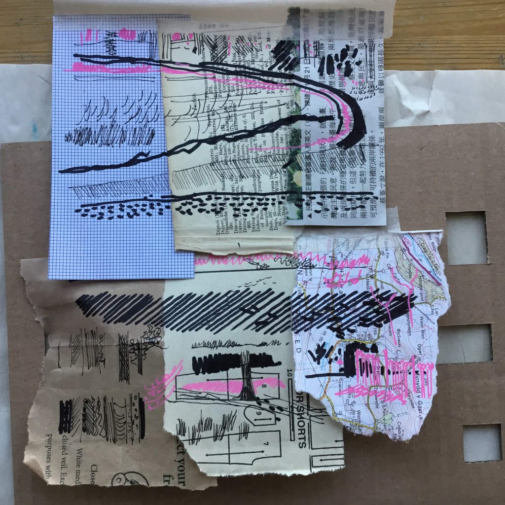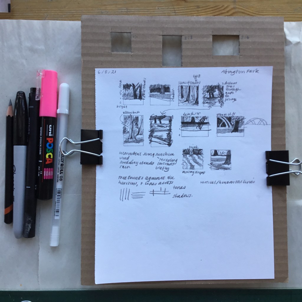 I started in a place I often sketch and walk, Abington Park. I wondered if I would be able to find my something but as soon as I got there I found it, recognising something that I always focus on and like to look at and sketch. That was the horizontal lines of sunshine and shadow with the tree trunks cutting vertically across them. This was accentuated today by the clouds, so that the sun would come out suddenly, reveal the something and then go in and it would disappear. After I had completed the thumbnails I took out, walking back, I saw loads of even better examples! My markmaking on the collage was hurriedly made as it began to rain.