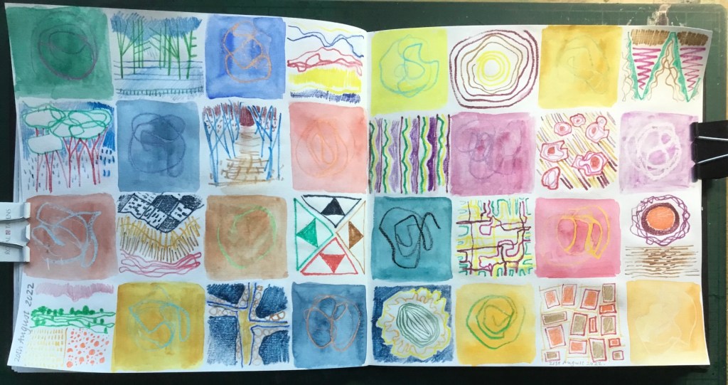 Filling in the gaps on yesterday’s chequerboard. My self generated rule was to wet the square and use the four surrounding colours of Inktense pencils intuitively draw and make marks.