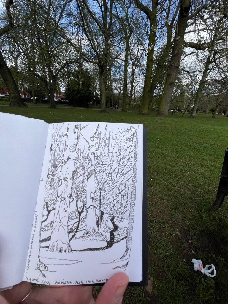 Abington Park, towards The Hill, annoyingly I had no pencil with me so had to use a pen. Milton Keynes brass band were playing, the first band of the season! it was very windy indeed.
