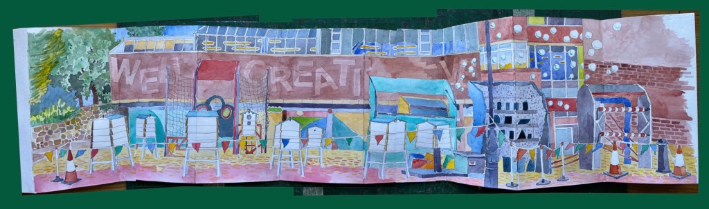 I sketched into a concertina sketchbook, sitting in the Market area. I had time to do all the drawing and some of the watercolour. I finished the watercolour painting later.