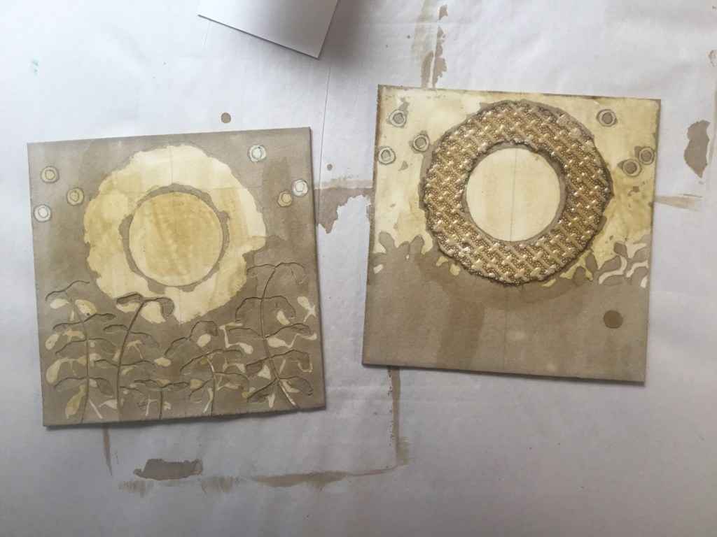 Plates for a new two plate collagraph print, a colour variation on an existing one